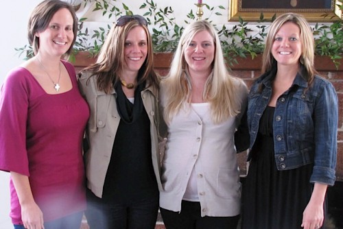 Four members of the class of 1997 (left to right Mindy Kearney, Melinda Beaman, and Blake Evans) got back together recently for a baby shower. This group was a big part of the 1994 team that won the school's first conference championship in women's tennis and posted the school's first winning record in the sport.
